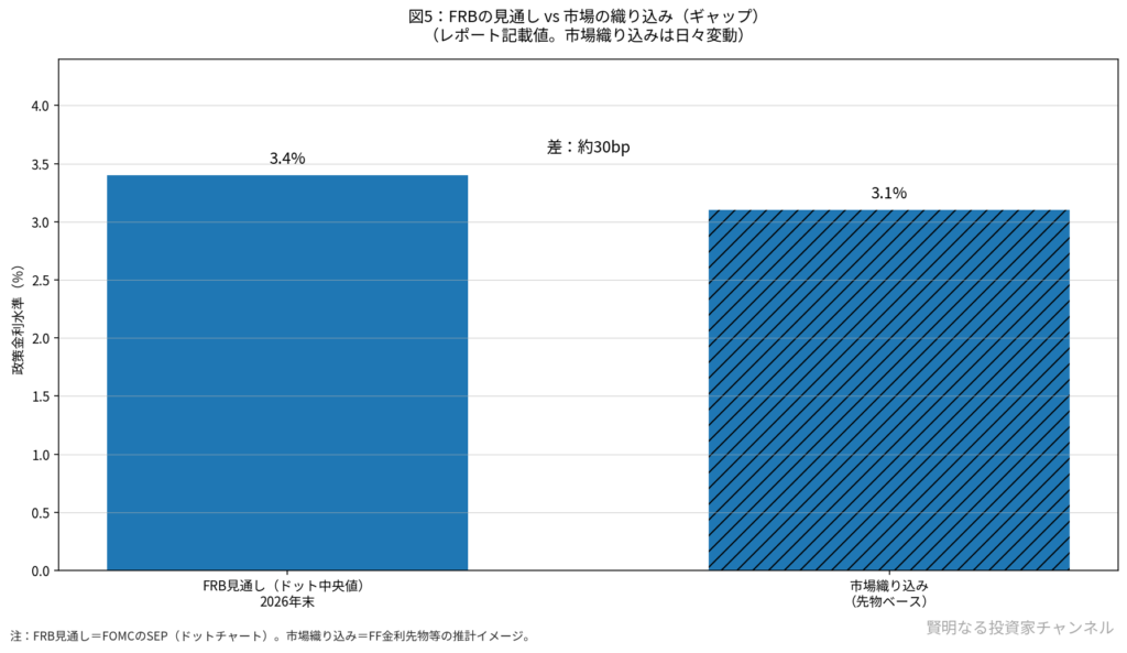 FRBの見通し(SEPのドットチャート)では、2026年末の政策金利は3.4%付近が中央値です。一方、市場は先物を通じて3.1%近辺までの低下を織り込む場面があり、約30bp(利下げ1回分強)のギャップが残ります。