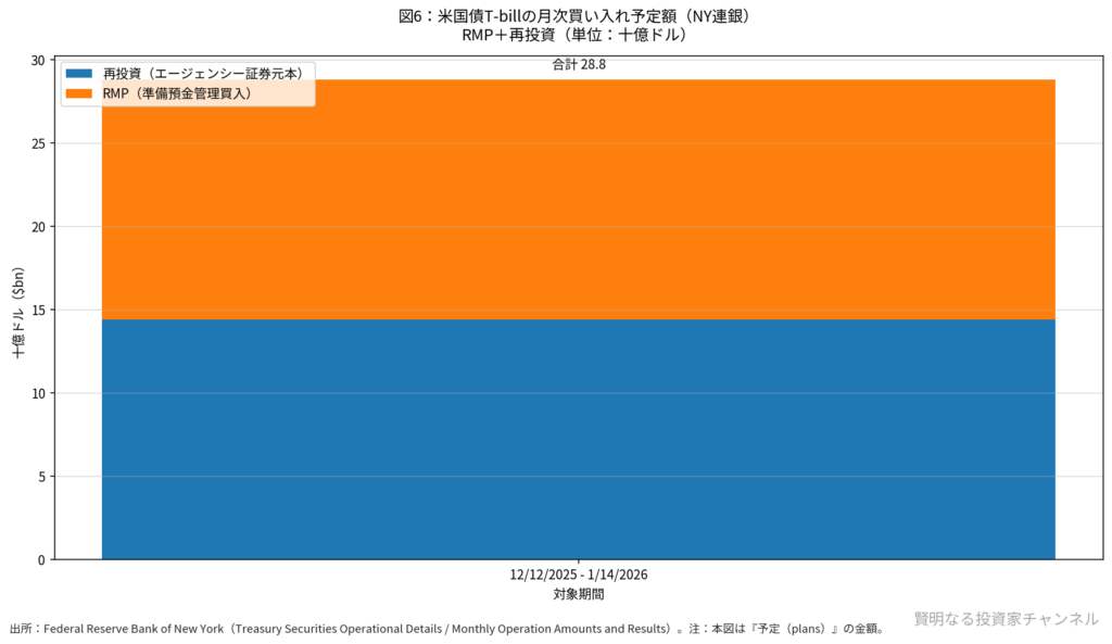 2025年12月から、FRBはRMP(準備預金管理買入)としてT-bill(米短期国債)の買い入れを開始しています。これは景気刺激のQEではなく、銀行システムの準備預金を「潤沢(Ample)」に保つための、いわば配管工事です。