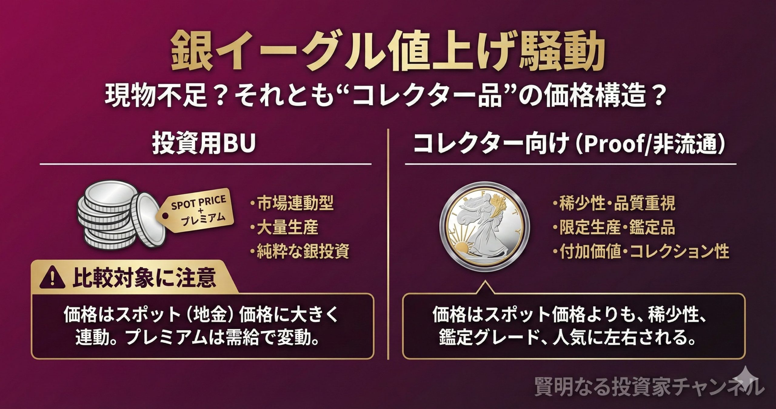 重要なのはここです:コレクター向け(Proof/Uncirculated)の定価と、投資用BUの市場価格は、価格の決まり方が別物です。