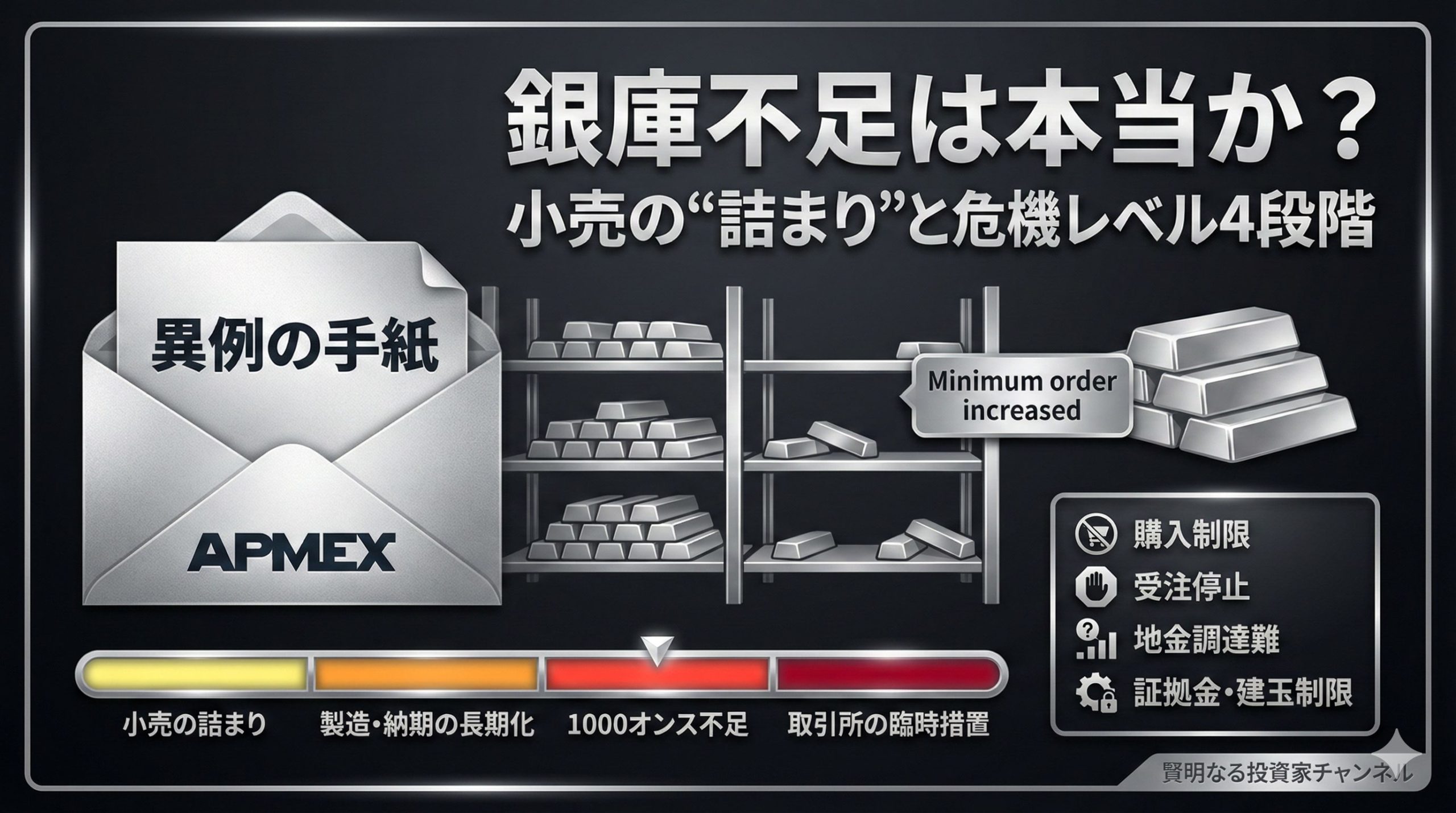「銀の在庫がヤバい」という話題が広がる中で、米大手貴金属ディーラーのAPMEXが、顧客向けに“異例の手紙”を出しました。内容は価格の見通しではなく、注文の急増で現場が回らなくなりかけているという、かなり実務的な話です。