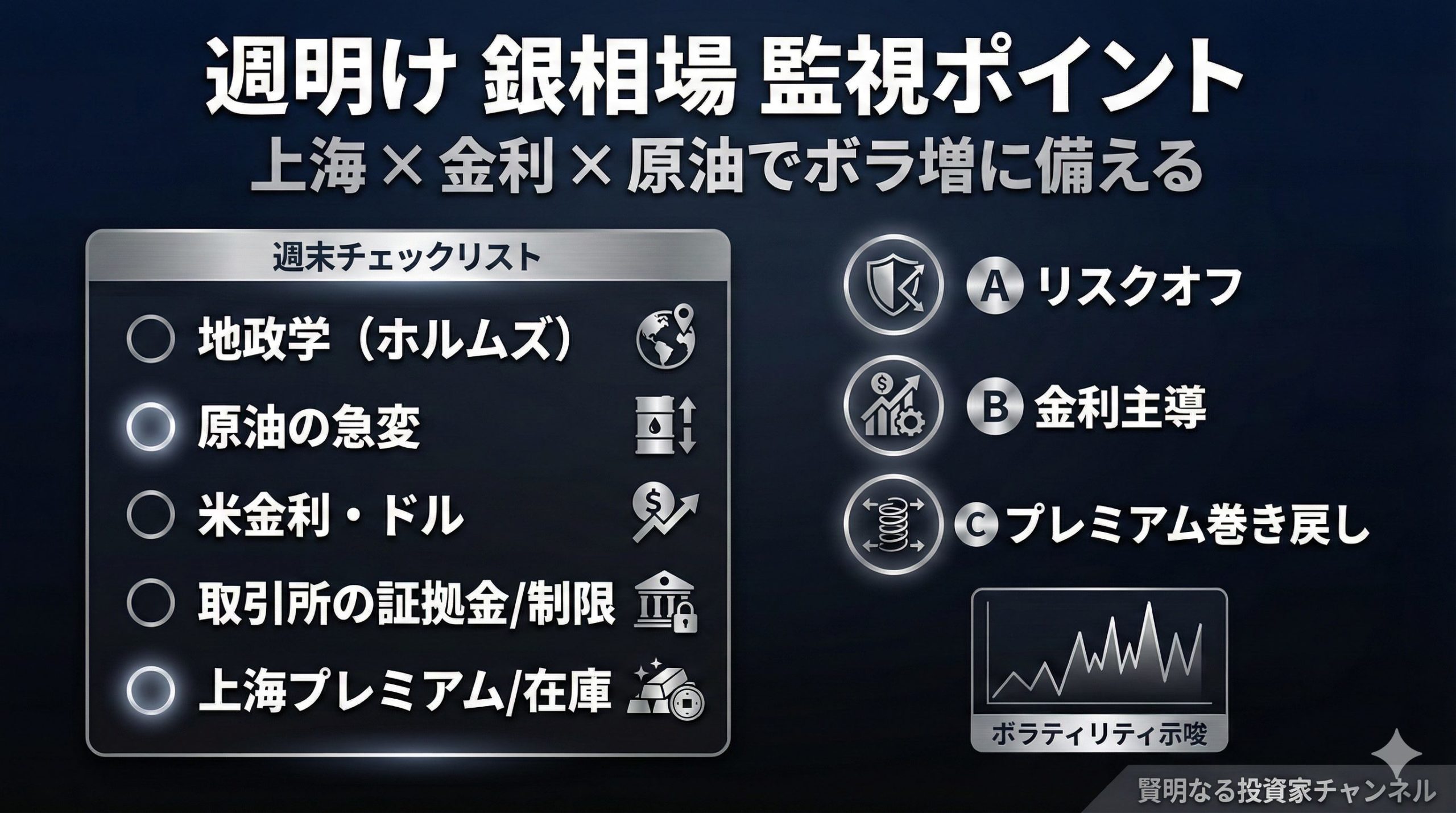 今週の銀相場は、「上海サイドの需給(じゅきゅう:モノの足りてる/足りてない)」が軸になりつつ、ここ数日は金の値動きに銀が素直についていく場面も増えています。つまり週明けは、銀“だけ”を見ていると判断が遅れやすく、上海(銀の芯)と、金を動かす外部要因(地政学・原油・米金利)をセットで監視するのが現実的です。