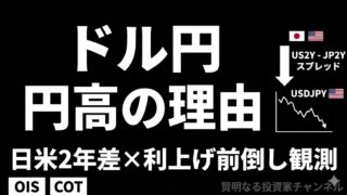 ドル円が円高に振れた背景を、日米2年金利差の縮小トレンドと「日銀利上げ前倒し観測(OIS)」、さらにCOTの円ショート偏りから整理。金利差は依然大きいのに円が買われた理由と、次に見るチェックポイントを解説します。