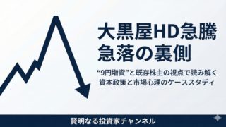 大黒屋HD(6993)の急騰急落局面を、業績下方修正・9円の第三者割当増資・再生ファンドの動き・メタプラネットとの違いなどから整理し、個人投資家がどこをチェックすべきかを解説するケーススタディです。